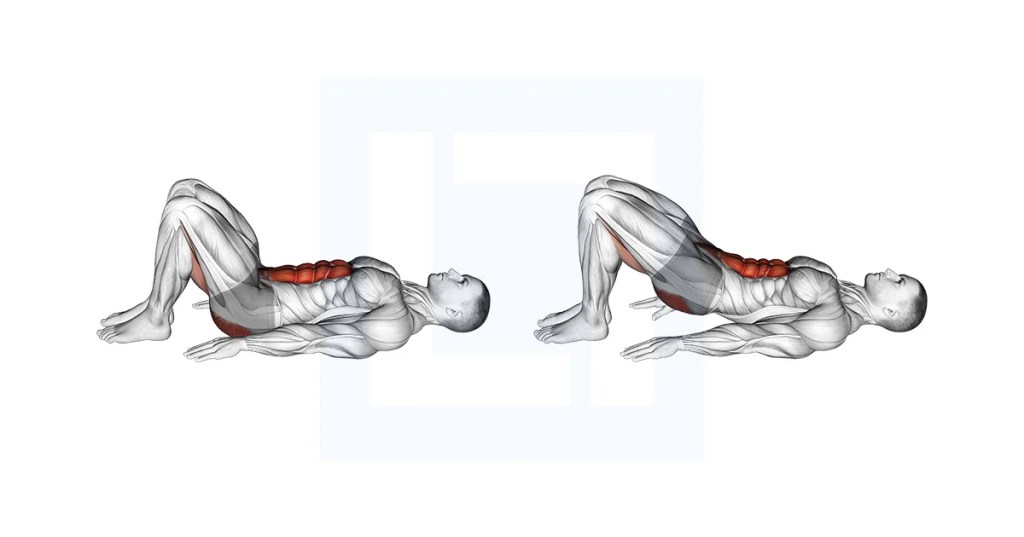 This one’s a sleeper exercise – meaning it looks easy, but if you do it right, your core and glutes will be on fire. Lie on your back, bend your knees, and push through your heels to lift your hips. But here’s the catch: don’t just lift and drop mindlessly. Squeeze your glutes at the top and keep your ribs down so your core stays engaged. If it feels too easy, try doing it with one leg lifted or placing a weight on your hips.