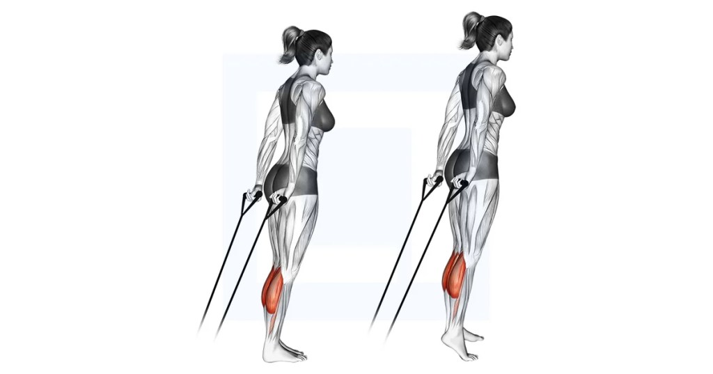 - Standing Calf Raises – Step on the band, hold handles at waist height, and raise onto your toes. Slow and controlled for max burn.