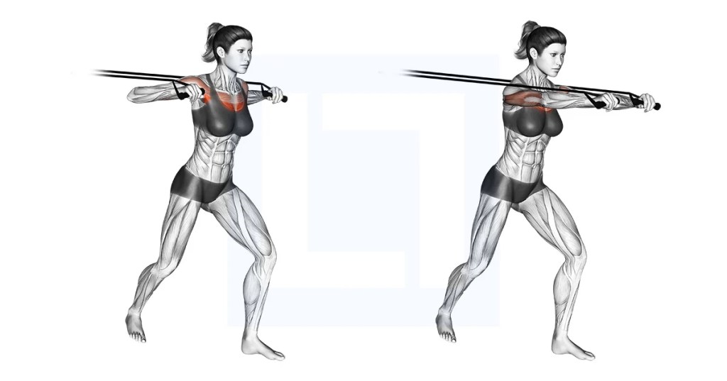 - Band Chest Press – Anchor the band behind you (door or sturdy object), press forward like a bench press. Control the return for max tension.