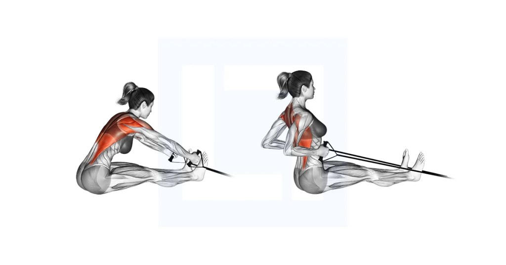 - Seated Row – Sit with legs extended, band wrapped around feet, pull handles toward your torso. Keep elbows close for that back pump.