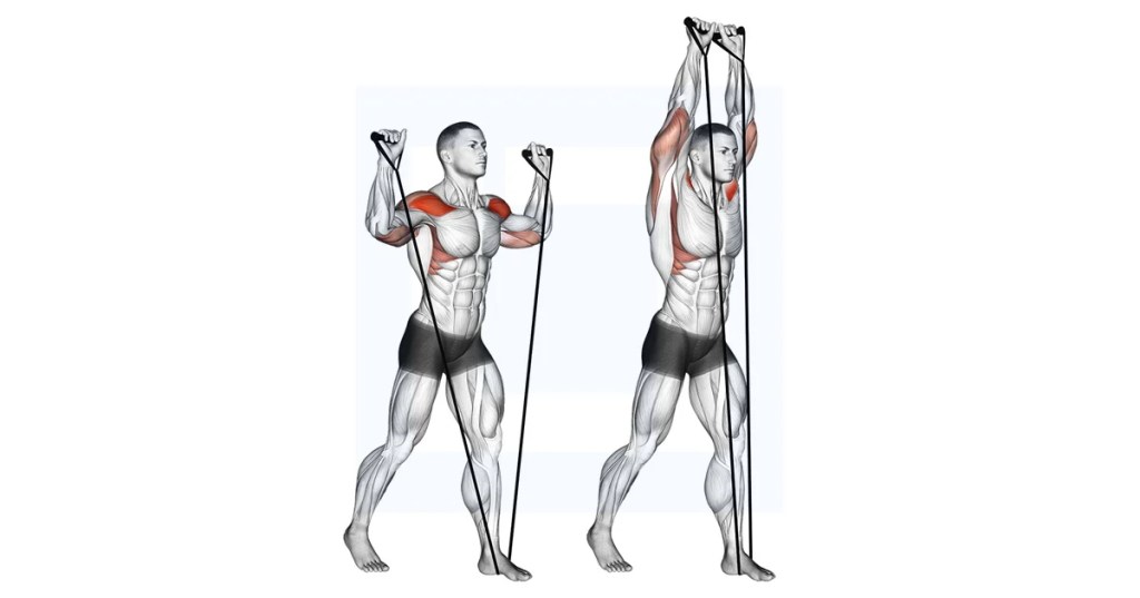 - Shoulder Press – Step on the band, press overhead. Keep core tight – no leaning!